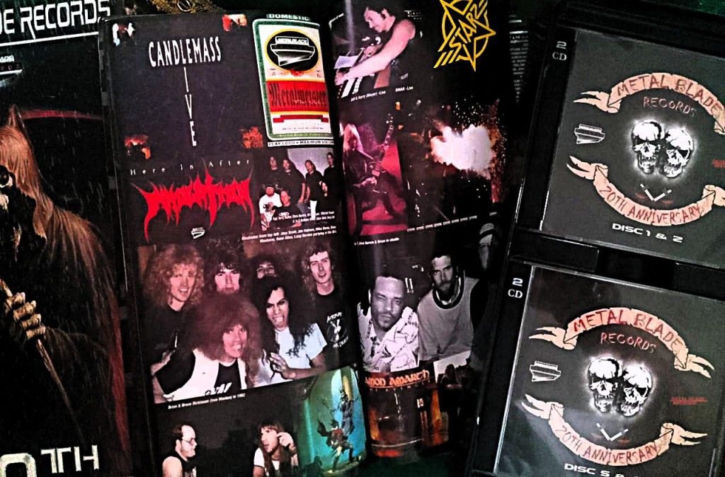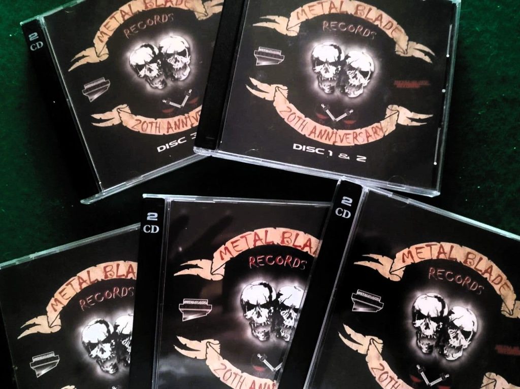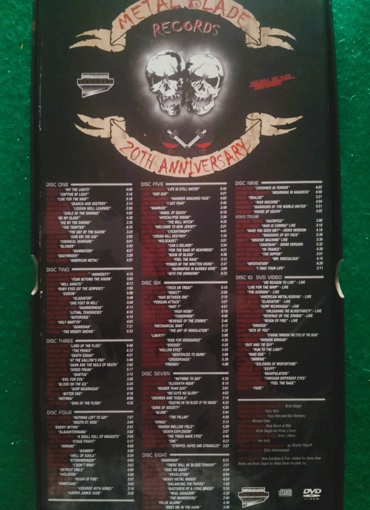 Yendo directo a la yugular, hace tiempo adquirimos esta cajita, una verdadera novedad y joya para su época: Metal Blade Records 20th Anniversary. Un box set que contiene 10 discos, 9 de ellos CD’s y el décimo es un DVD con varios sencillos de los grupos que engrosaban este sello. Y vaya rolas y artistas que estaban en esos años mozos con el buen Brian Slagel.